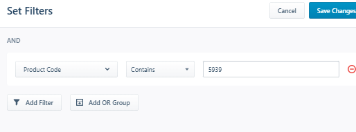 In the below example, I selected the operator "contains" and my example was "5939" on the "Product Code".