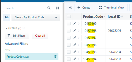 Product Code search partial match