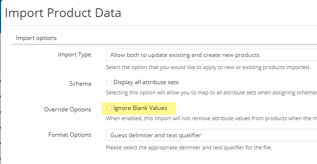 Having this value NOT checked by default I can see only being a big problem for someone. This should be selected by default to err on the side of human error. Since this is a function that can change data unknowingly. An example would be someone using a prior template that had columns in it with blank data and forgetting to delete the blanks before import. Or, a long import file where some calculations or formulas were used which produced no result (blank cells) and may have been overlooked. If a user accidentally missed seeing some blanks for an import of data for existing products, they would be deleting the values in the database. This suggestion comes from experience with import overrides.